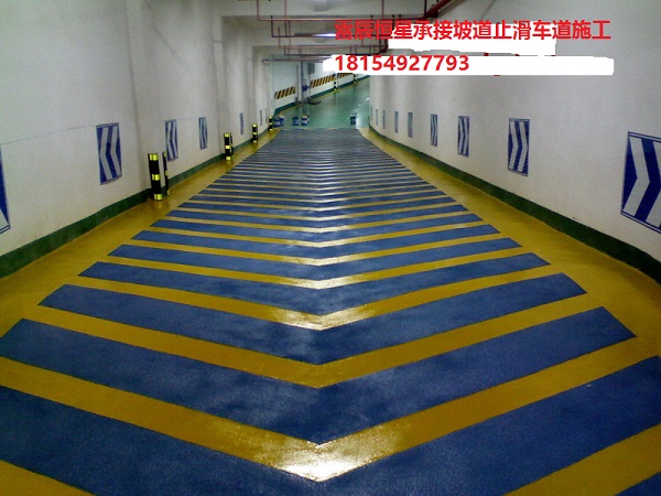 防滑車道又稱無震動(dòng)止滑車道、停車場(chǎng)防滑坡道、暴砂防滑地面、止滑型坡道、停車場(chǎng)防滑地坪漆等。專門用于各類停車場(chǎng)上、下坡道場(chǎng)所。防滑車道材料一種雙組份、反應(yīng)硬化性材料,主要成分由是改性樹脂和C料組成,含有多 角性硬度極高的骨材,利用巨大比表面積,達(dá)到防滑效果